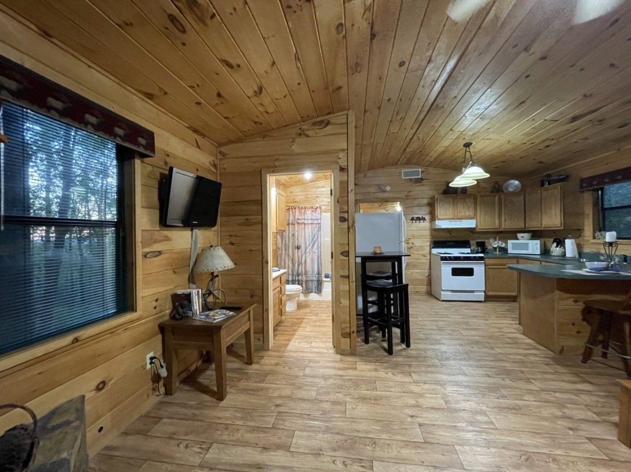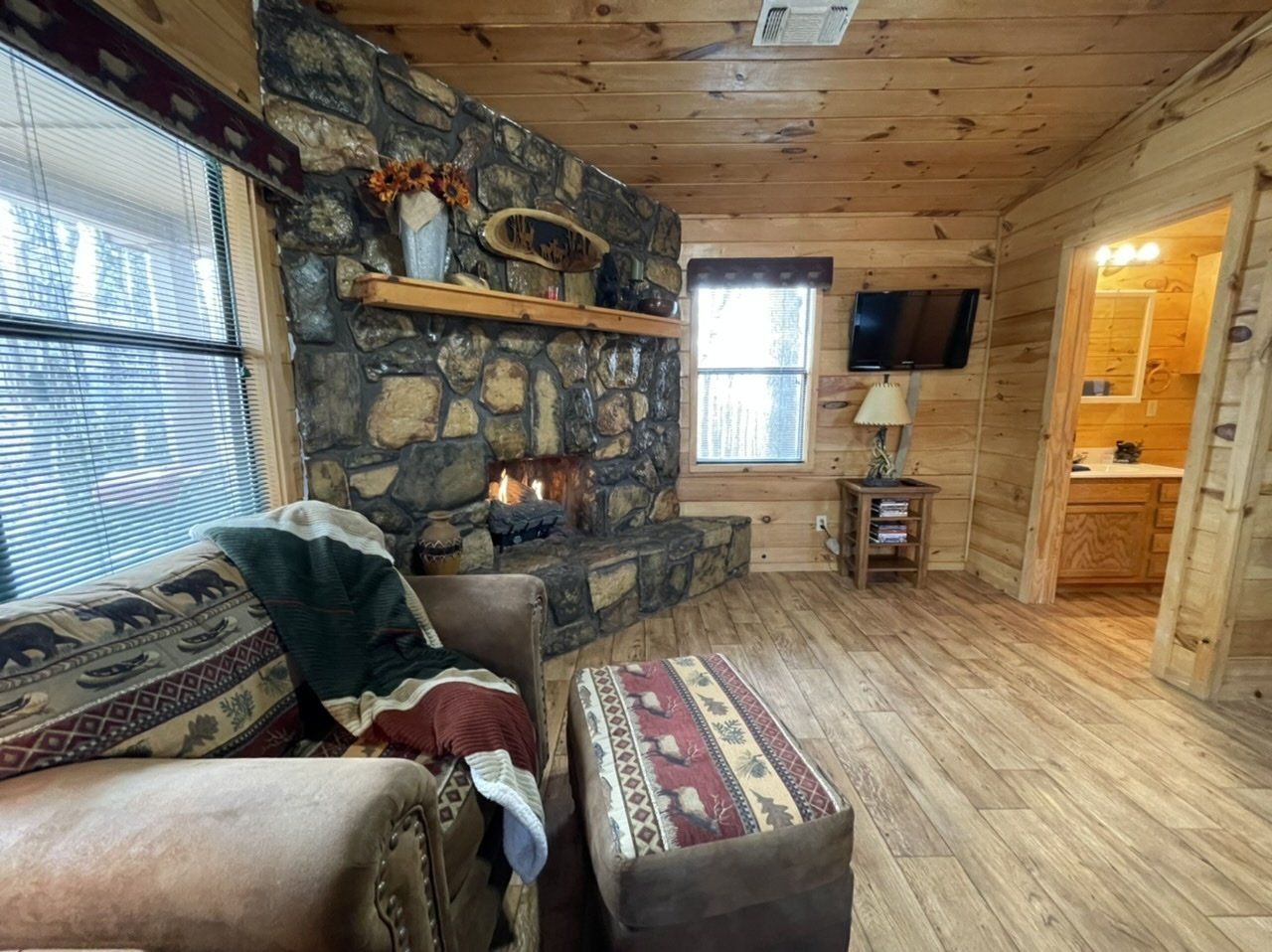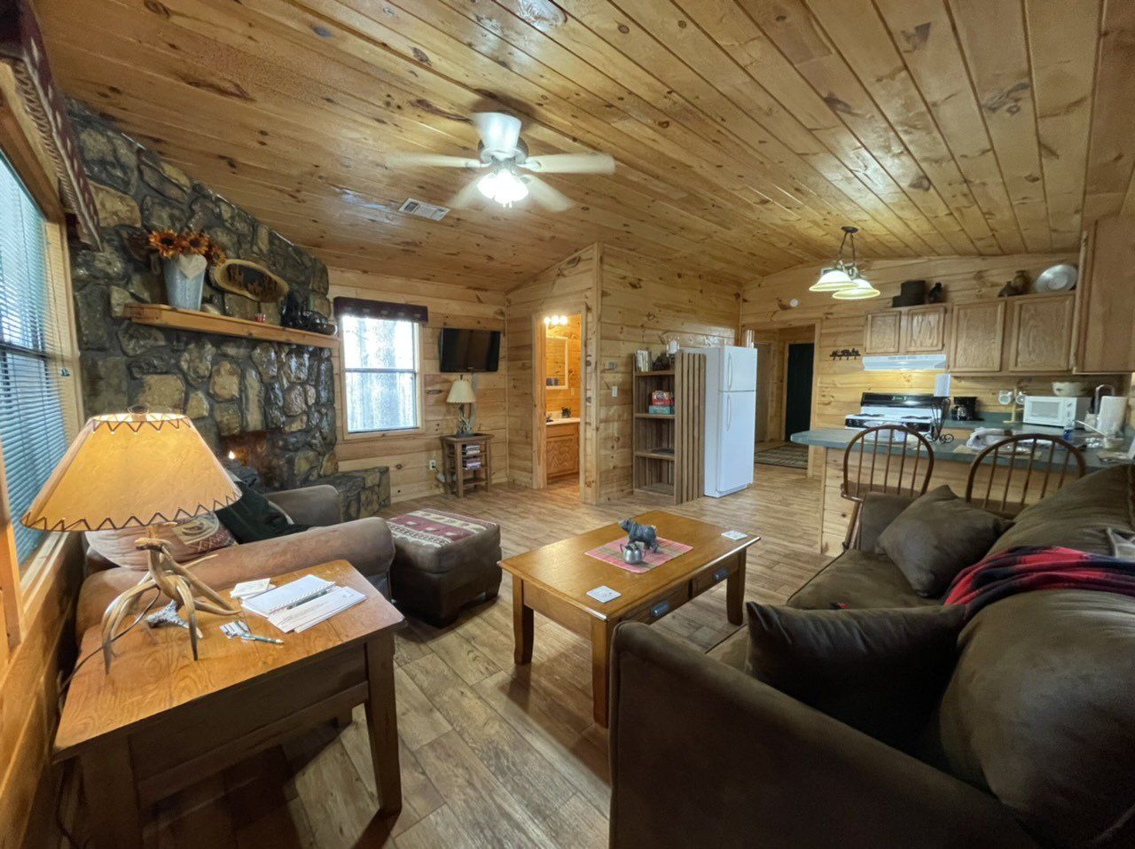 Unwind with a quiet, secluded weekend at our Bear Track Cabin. This cabin can boast a fully stocked kitchen complete with a propane gas combination stove and oven, full-sized refrigerator, coffee pot, and microwave. It offers a bedroom with a king-sized bed, a walk through room with a full size bed, a propane gas fireplace, television, and a tub shower for your convenience. Enjoy a beautiful view of the sunset over the mountains right from king size master bed! Take advantage of our outdoor grill while lounging on the welcoming entrance deck.